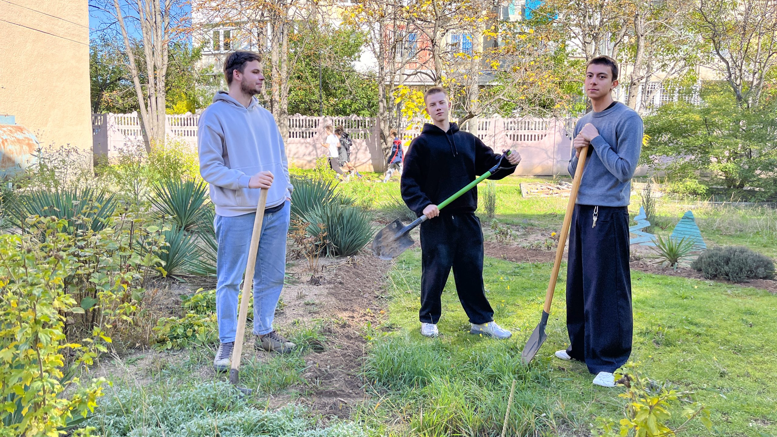Студенты группы 3КСК29, под руководством куратора, преподавателя высшей категории Соловьева Валерия Ивановича, в свободное от учебных занятий время,подготавливают к зиме, закреплённый за группой, на территории колледжа, земельный участок. Обрезают сухие ветки, собирают опавшую листву, перекапывают землю.