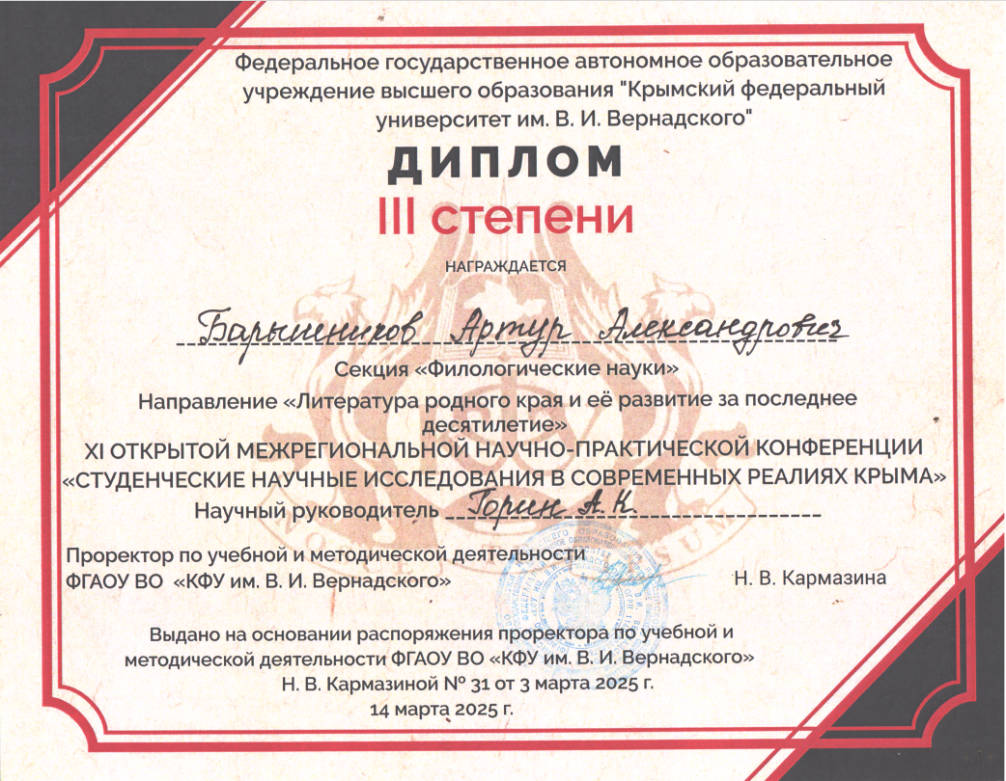 - XI Открытая межрегиональная научно-практическая конференция «Студенческие исследования в современных реалиях Крыма», секция «Филологические науки», Диплом II степени.