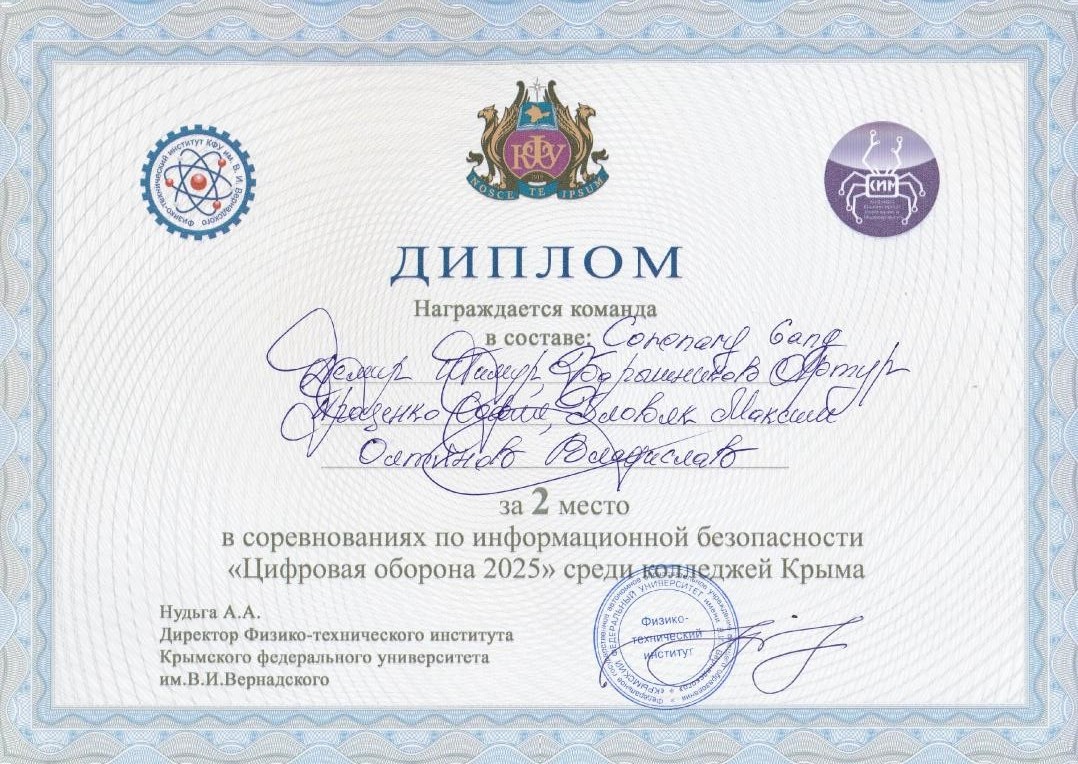 - «Цифровая оборона 2025» – соревнования по информационной безопасности среди колледжей Крыма, Диплом за 2 место;