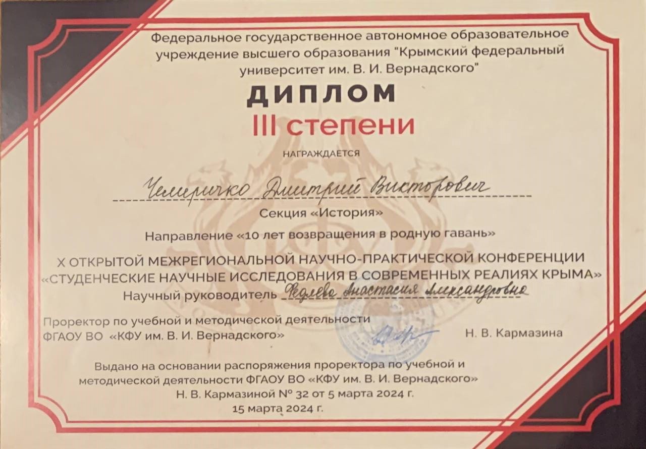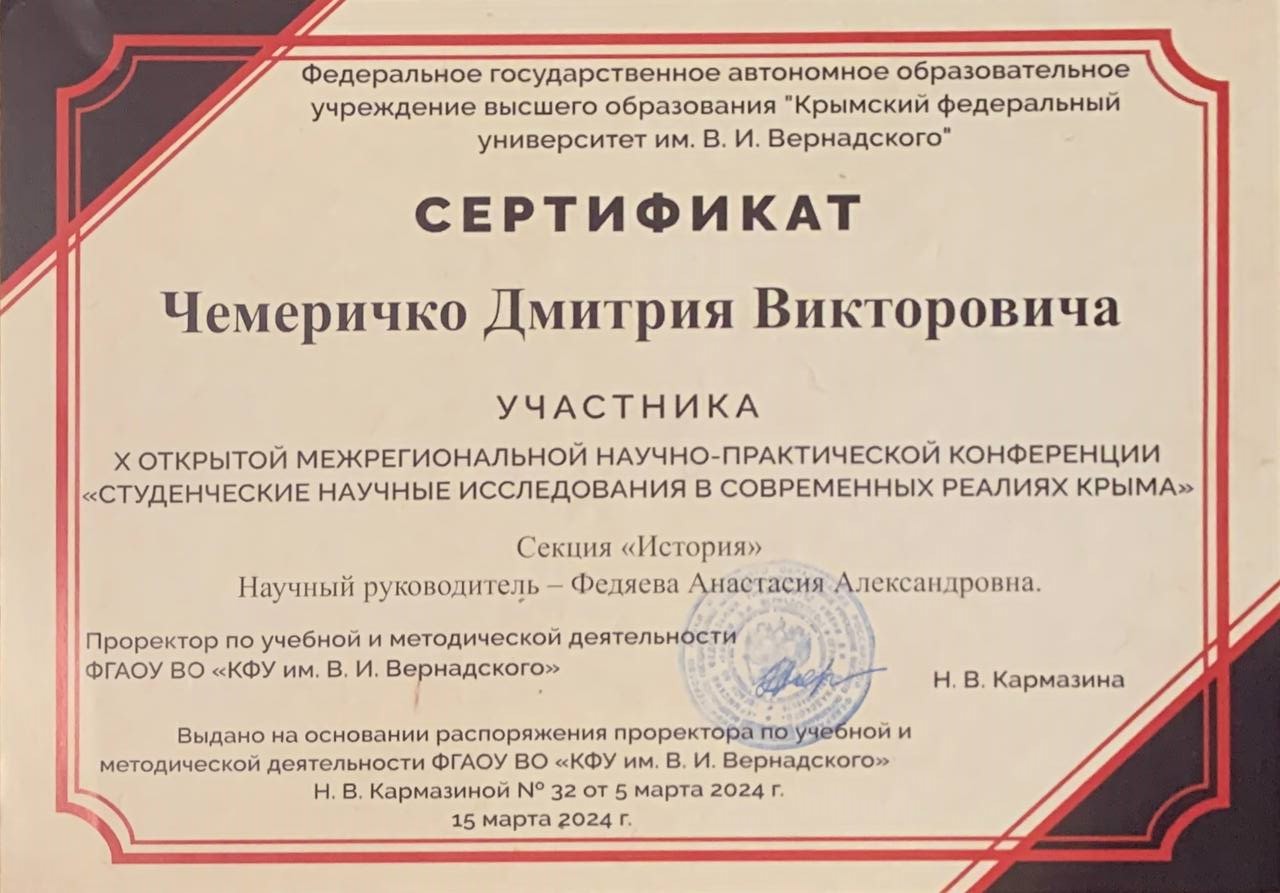 - Сертификат за участие в Открытой межрегиональной научно-практической конференции «Студенческие научные исследования в современных реалиях Крыма».