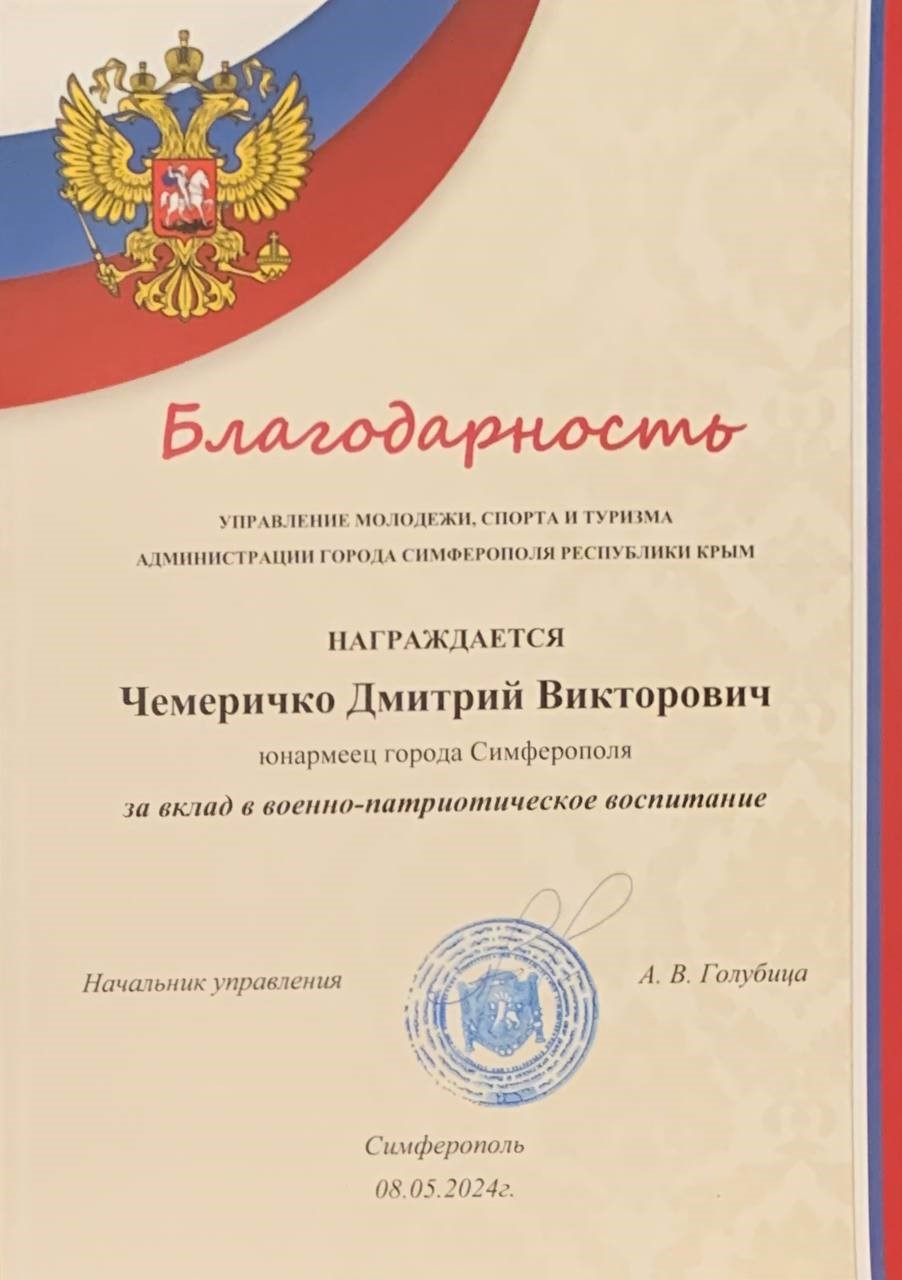 - Благодарность от Управления молодежи, спорта и туризма Администрации г. Симферополь Республики Крым за вклад в военно-патриотическое воспитание;