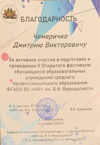 - Благодарность за активное участие в подготовке и проведении V Открытого фестиваля обучающихся образовательных учреждений среднего профессионального образования ФГАОУ ВО «КФУ им. В.И. Вернадского»;