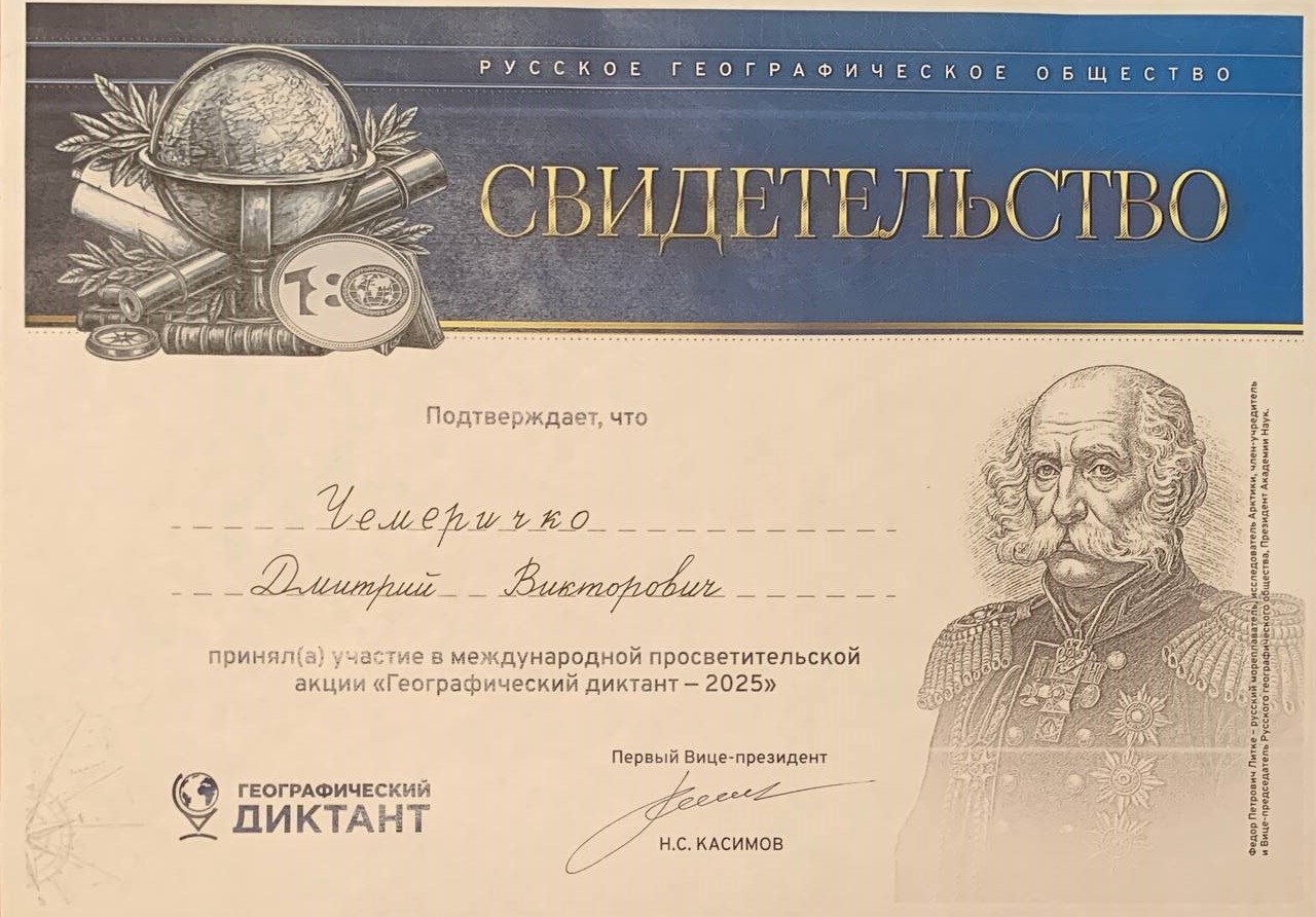 - Свидетельство об участии в Международной просветительской акции «Географический диктант – 2025»;