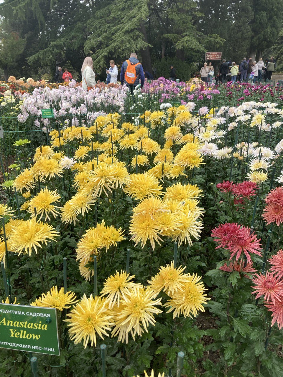 К этому времени распустились цветки всех сортов. Буйство красок, опьяняющий аромат осени, высажено 472 вида хризантем — невероятное зрелище. Повезло с погодой: пасмурно, но тихо- тихо, тепло, такая приятная осень в Крыму. День промчался незаметно.