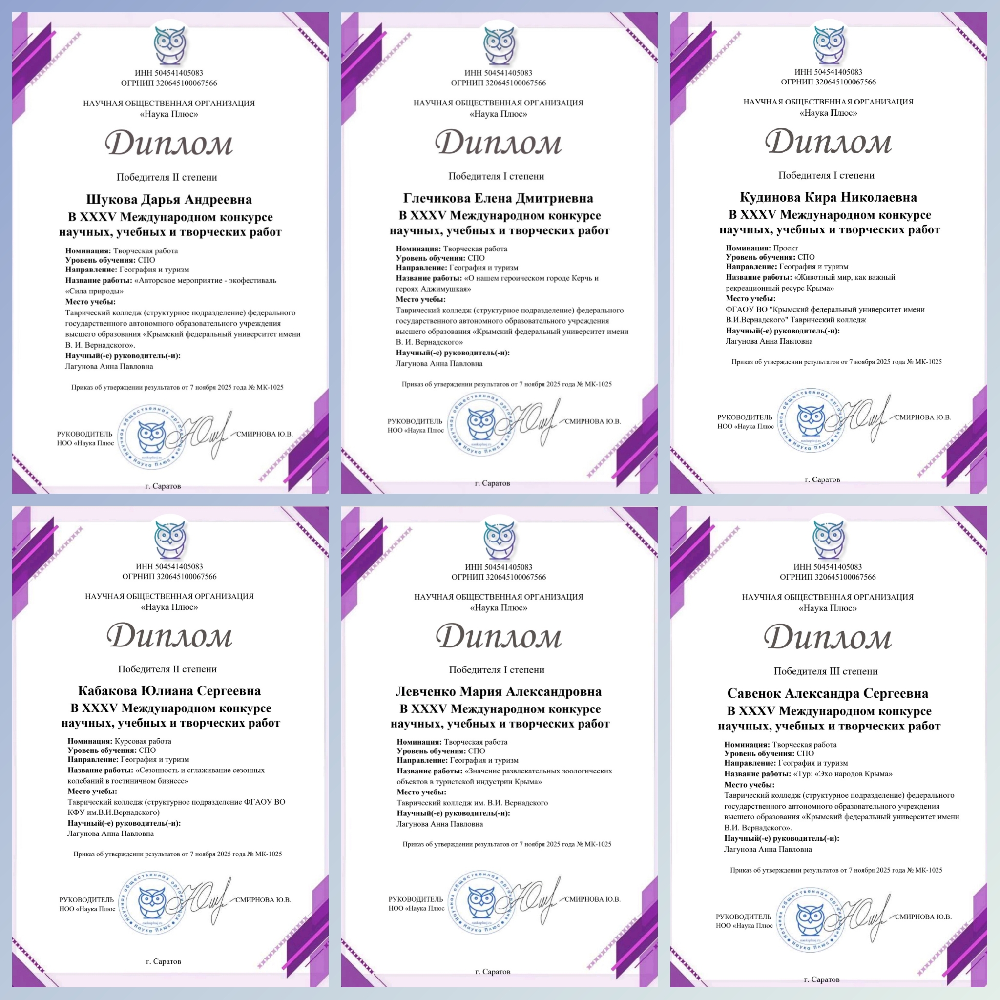 В октябре обучающиеся специальности «Туризм» под руководством преподавателя Лагуновой А.П. приняли участие в Международном конкурсе научных, учебных и творческих работ для студентов, организованном НОО «Наука плюс», по направлению География и туризм.