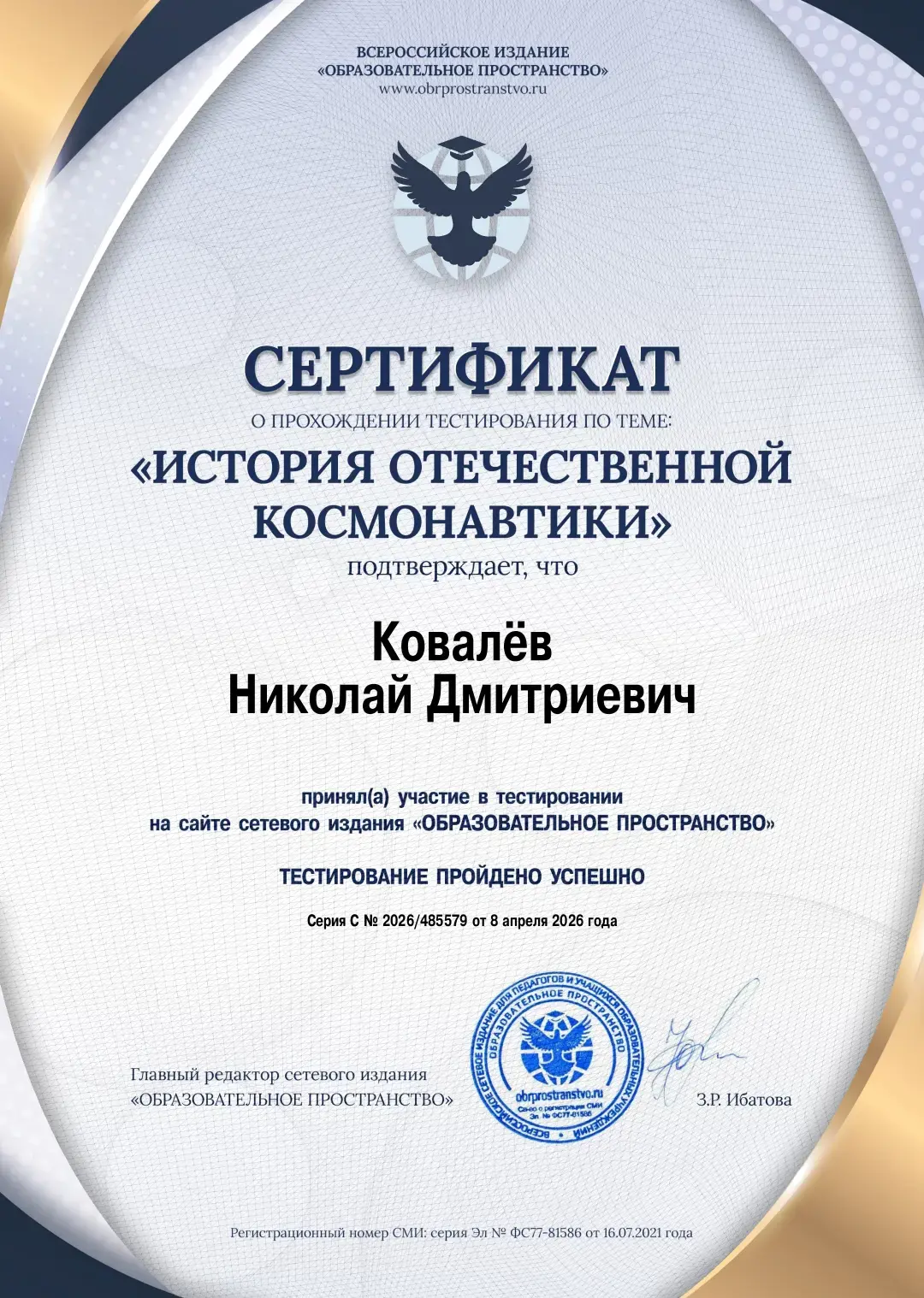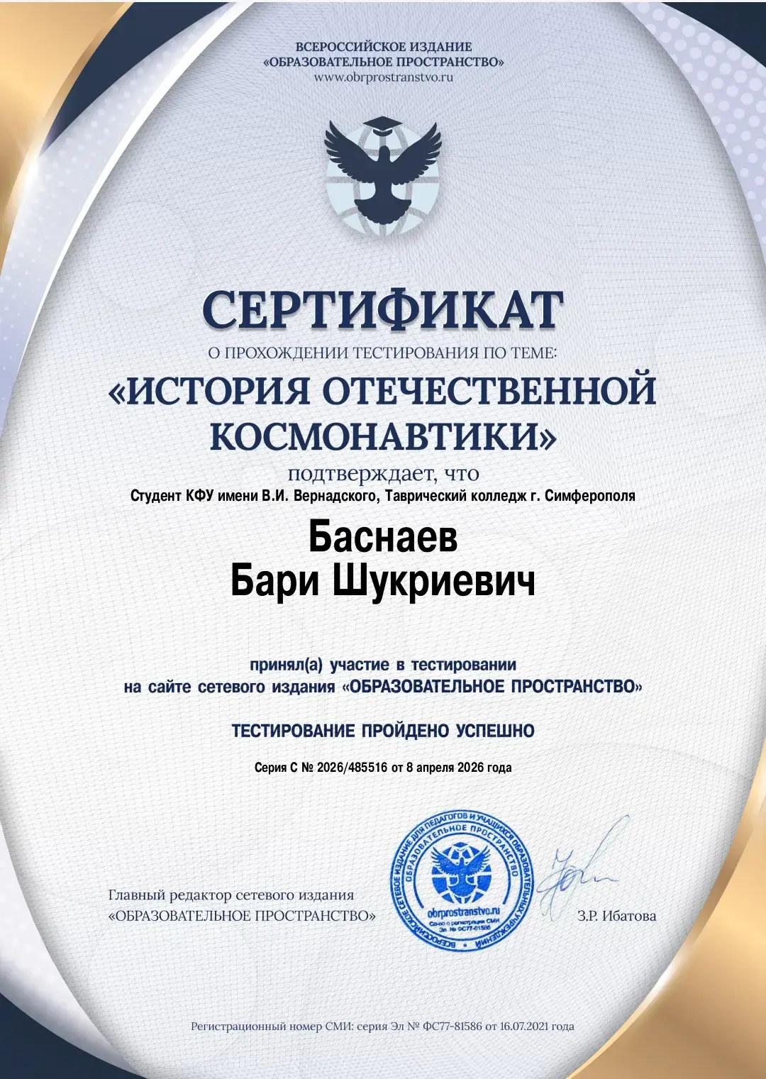Некоторые студенты группы прошли онлайн тестирование на сайте издания «Образовательное пространство» по теме История отечественной космонавтики.
