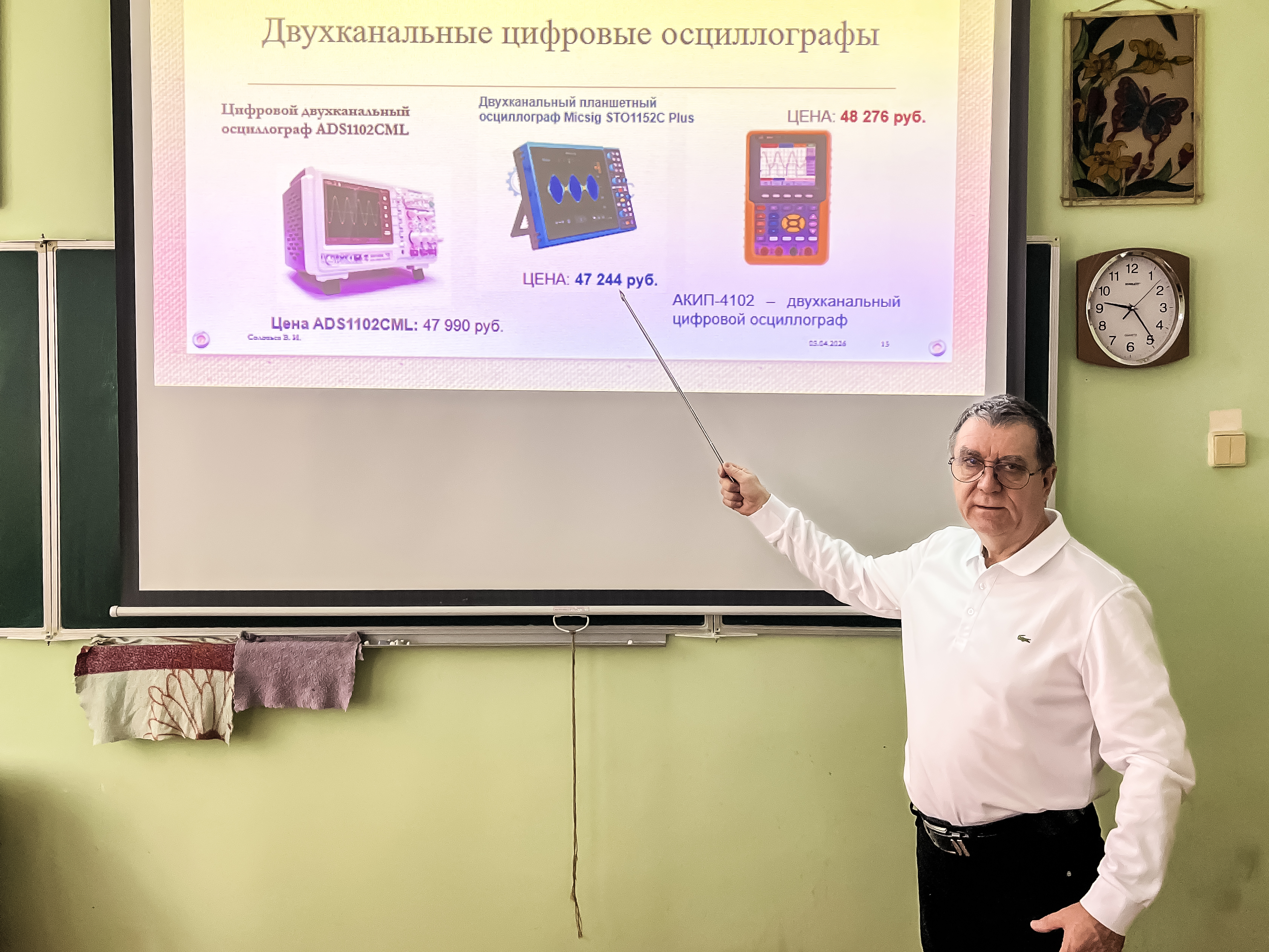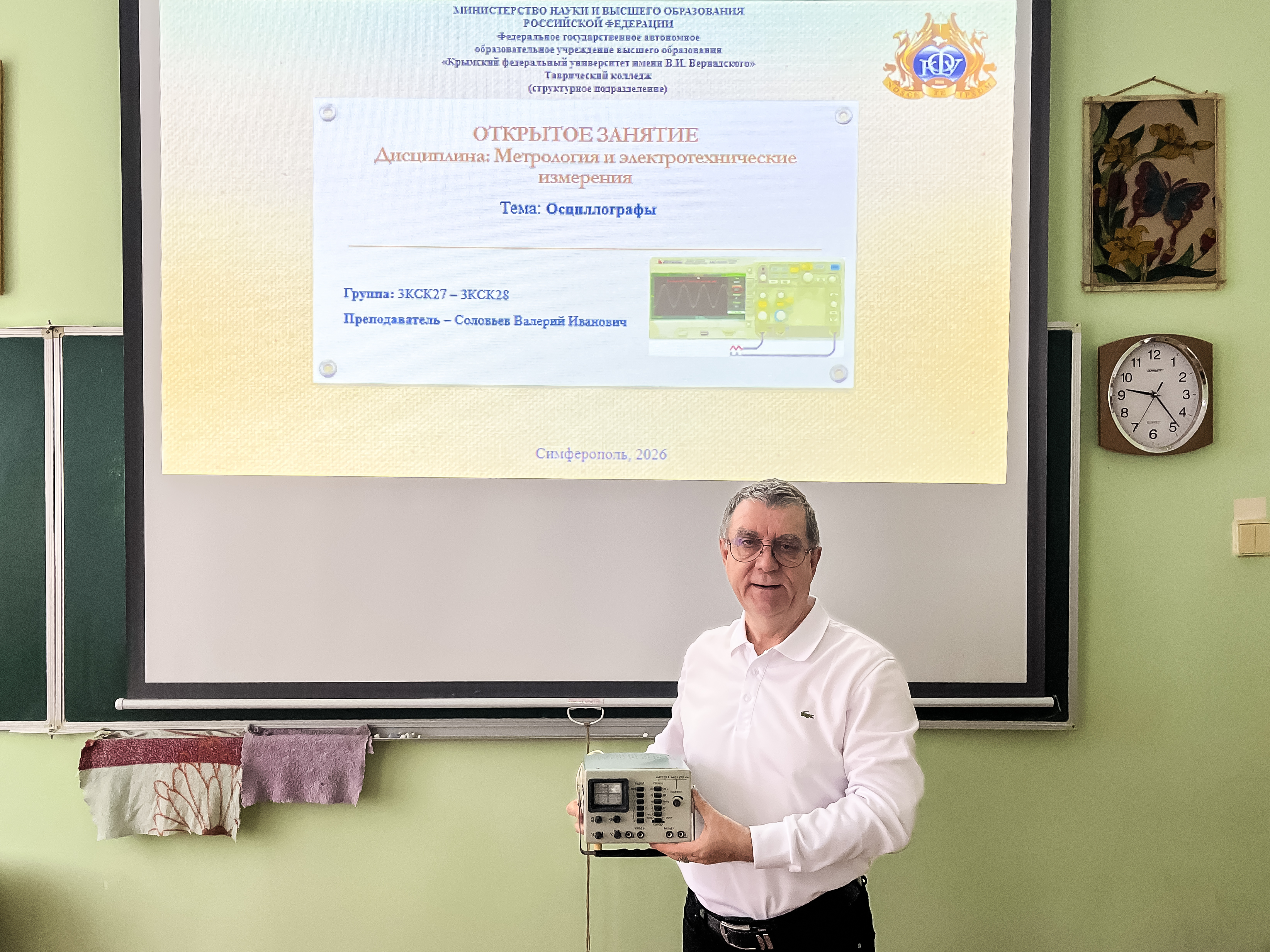 Преподаватель высшей категории Соловьев Валерий Иванович, 03 апреля 2026 г., в группах 3КСК27, 3КСК28, специальности 09.02.01 Компьютерные системы и комплексы, провёлоткрытое занятие по дисциплине «Метрология и электротехнические измерения», тема «Осциллографы».