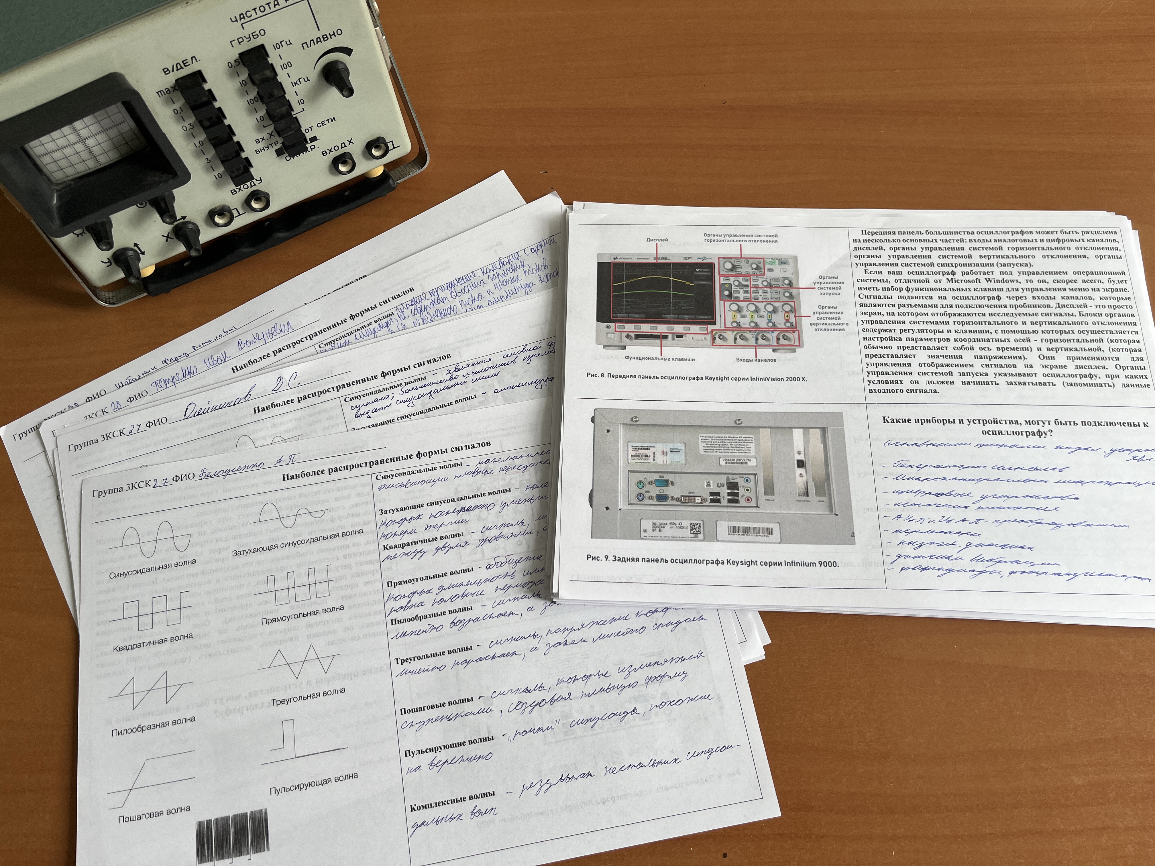 На занятии изучались электронные осциллографы, история их изобретения, первые модели осциллографов, современные цифровые осциллографы. Во время учебного занятия были реализованы межпредметные связи с дисциплиной СГ 02. «Иностранный язык в профессиональной деятельности». Особое внимание уделялось применению мобильных телефонов во время учебного занятия, для работы с электронными учебными пособиями и справочной литературой, а также информационными Интернет — источниками! Студенты выполнили практическую работу по изучению особенностей наиболее распространенных форм сигналов осциллографов.