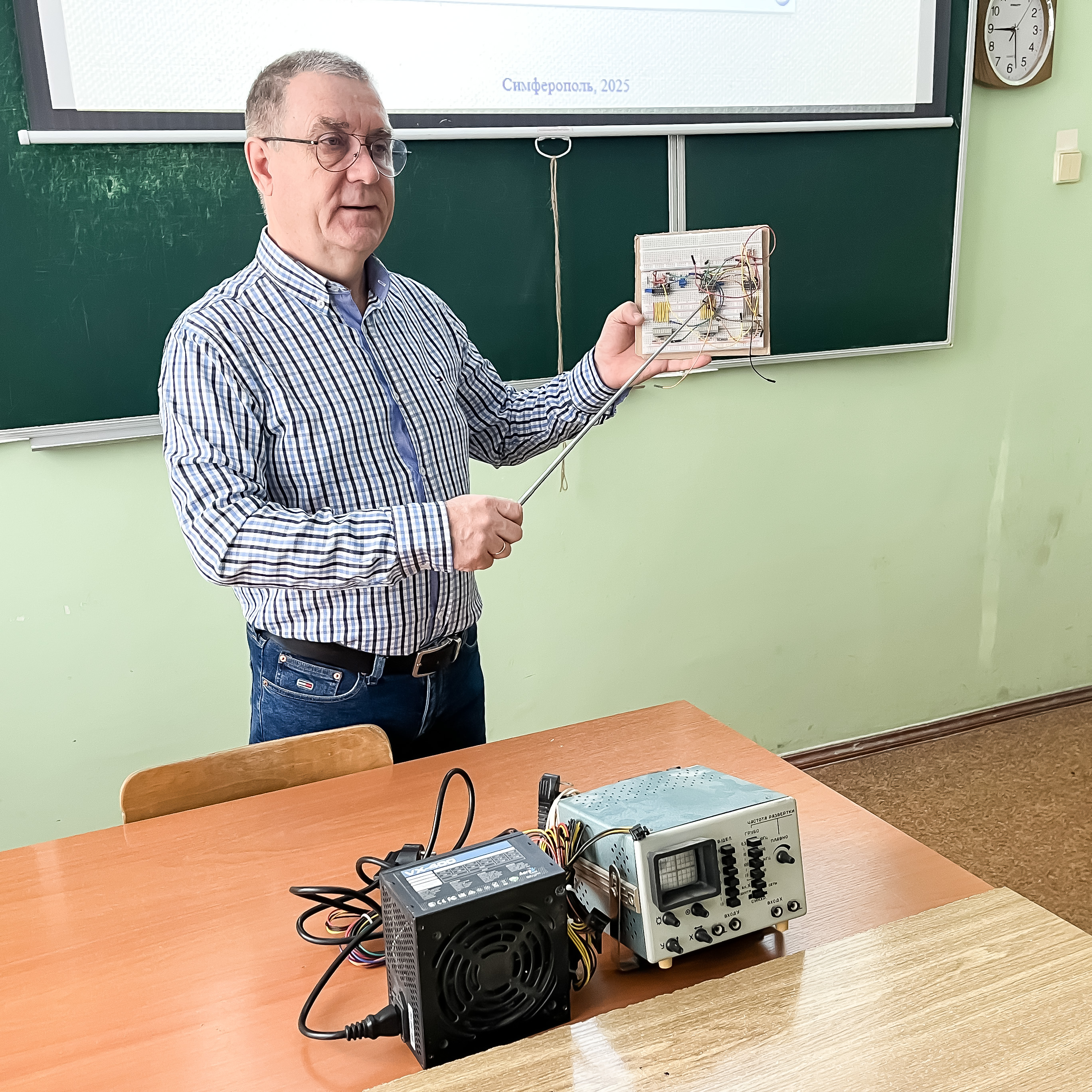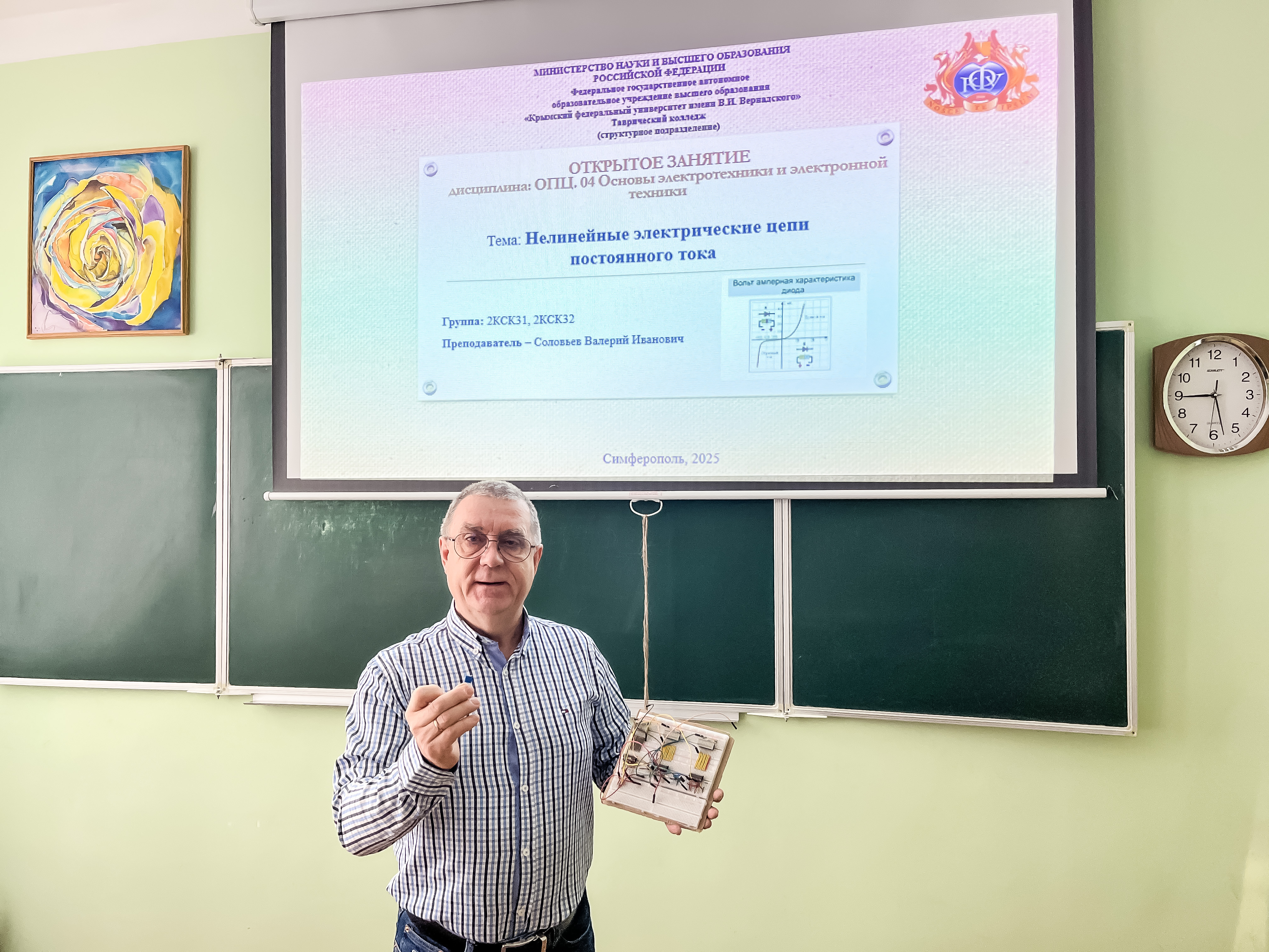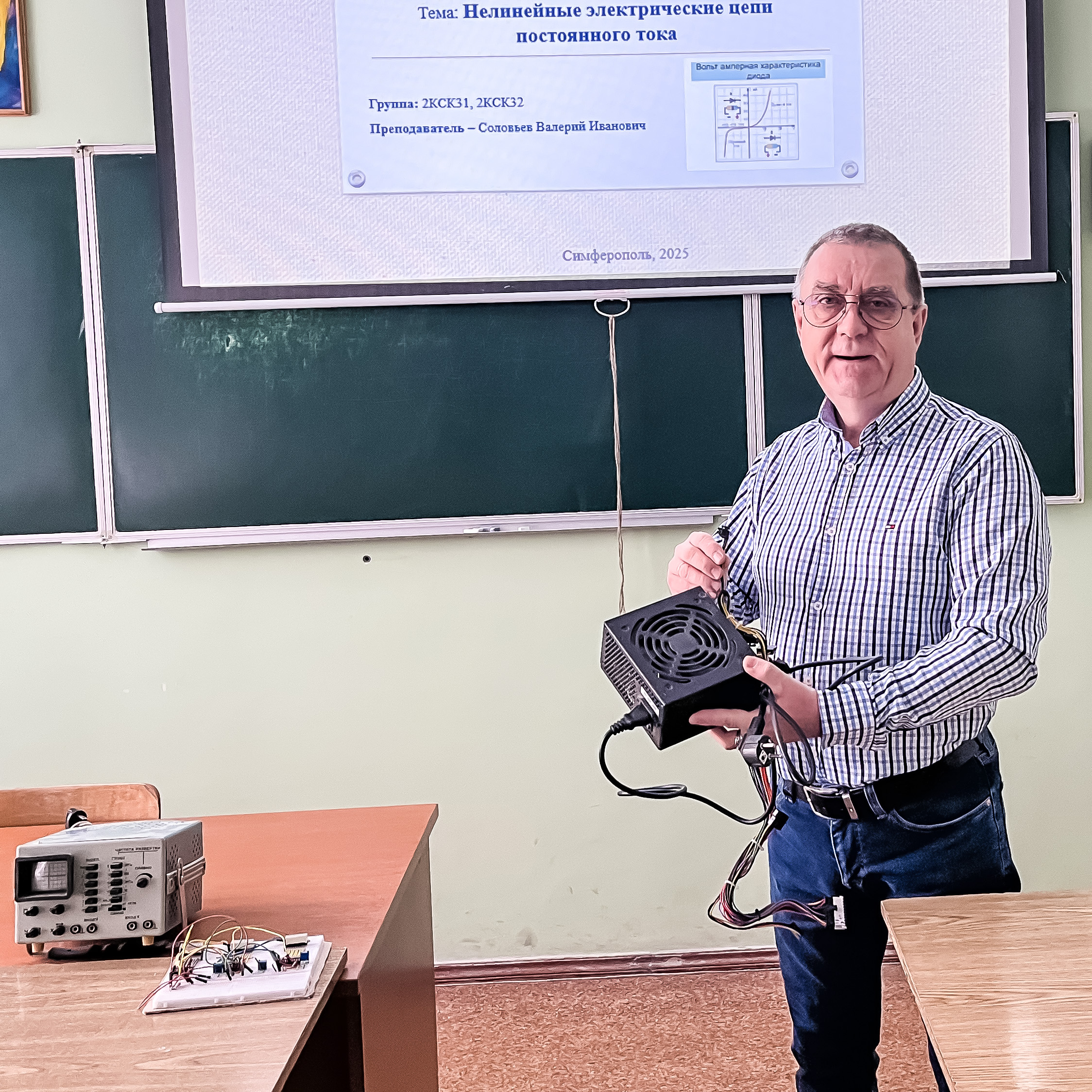 Преподаватель высшей категории Соловьев Валерий Иванович 08 декабря 2025 года провёл открытое занятие по дисциплине ОПЦ. 04 Основы электротехники и электронной техники в группах 2КСК31, 2КСК32 специальности 09.02.01 Компьютерные системы и комплексы.