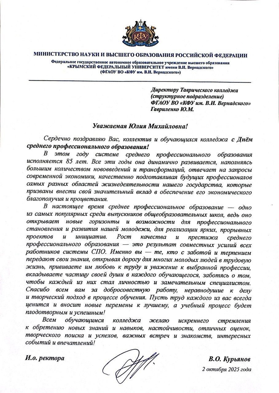 Поздравление коллектива колледжа с Днем среднего профессионального образования от исполняющего обязанности ректора Крымского федерального университета В. О. Курьянова.