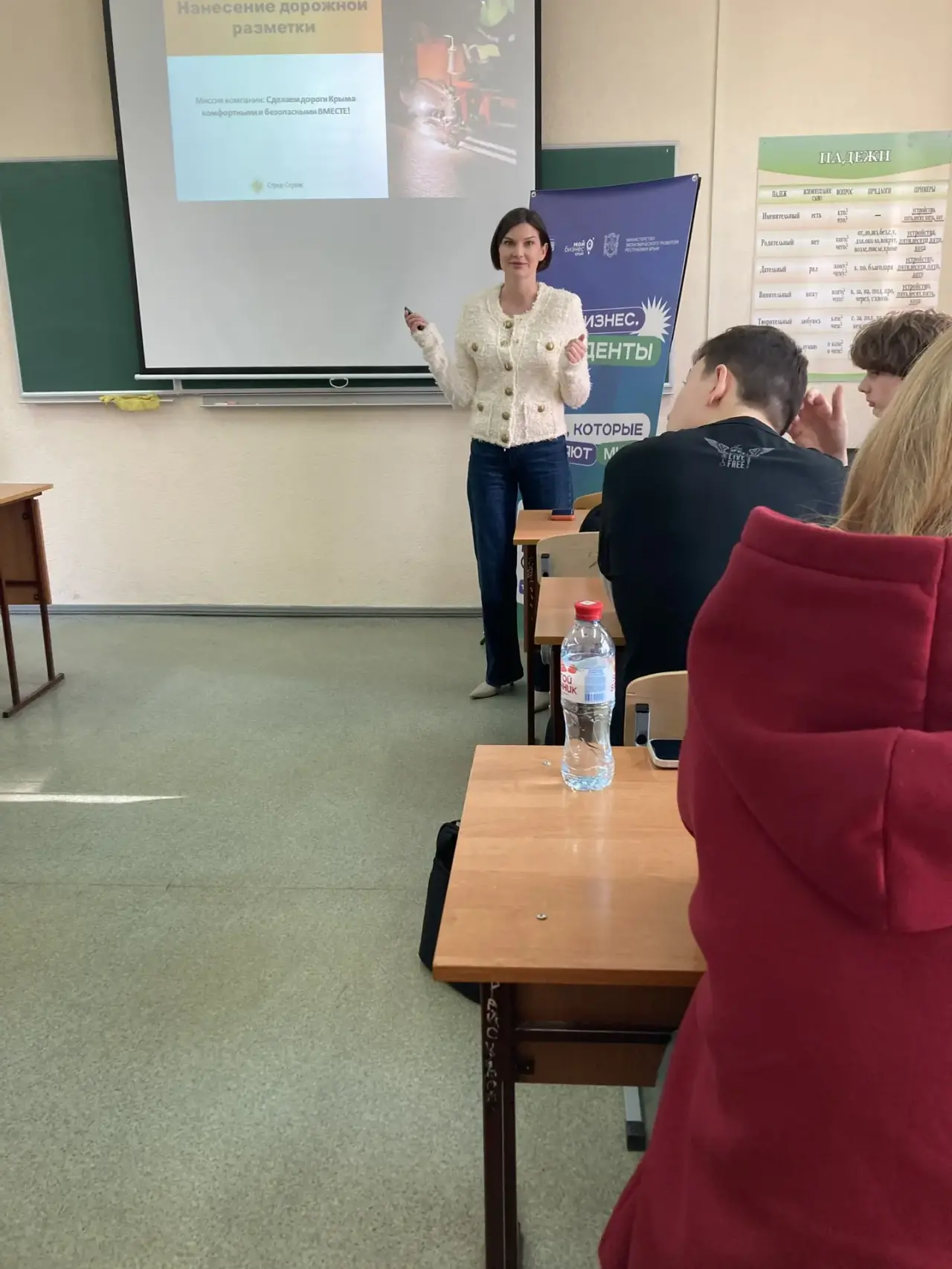 К ребятам пришла директор компании по нанесению дорожной разметки, Охтя Анна. Анна стала победителем конкурса «Лучший предприниматель-женщина в Крыму». Анна рассказала студентам о своей истории бизнеса.