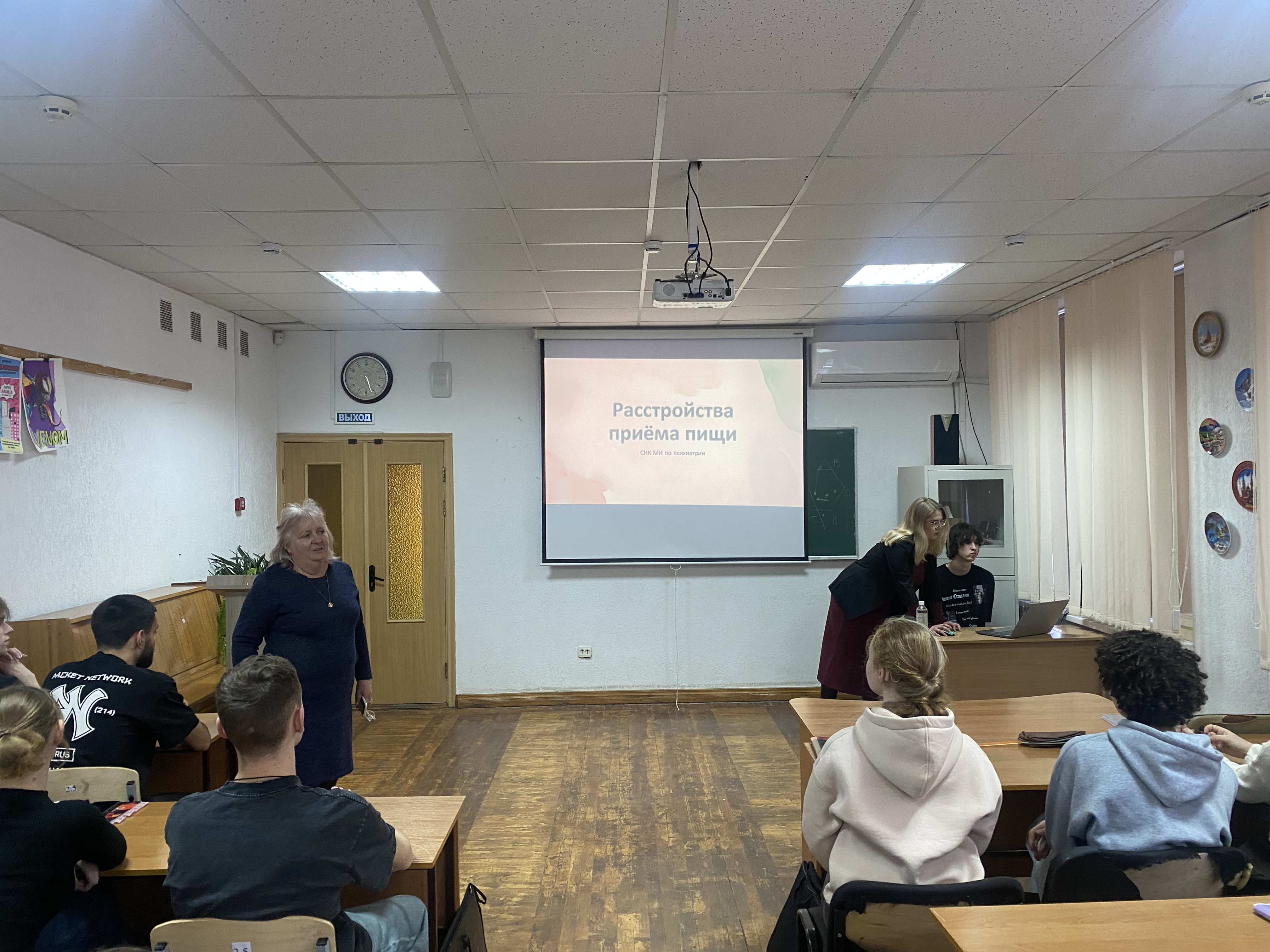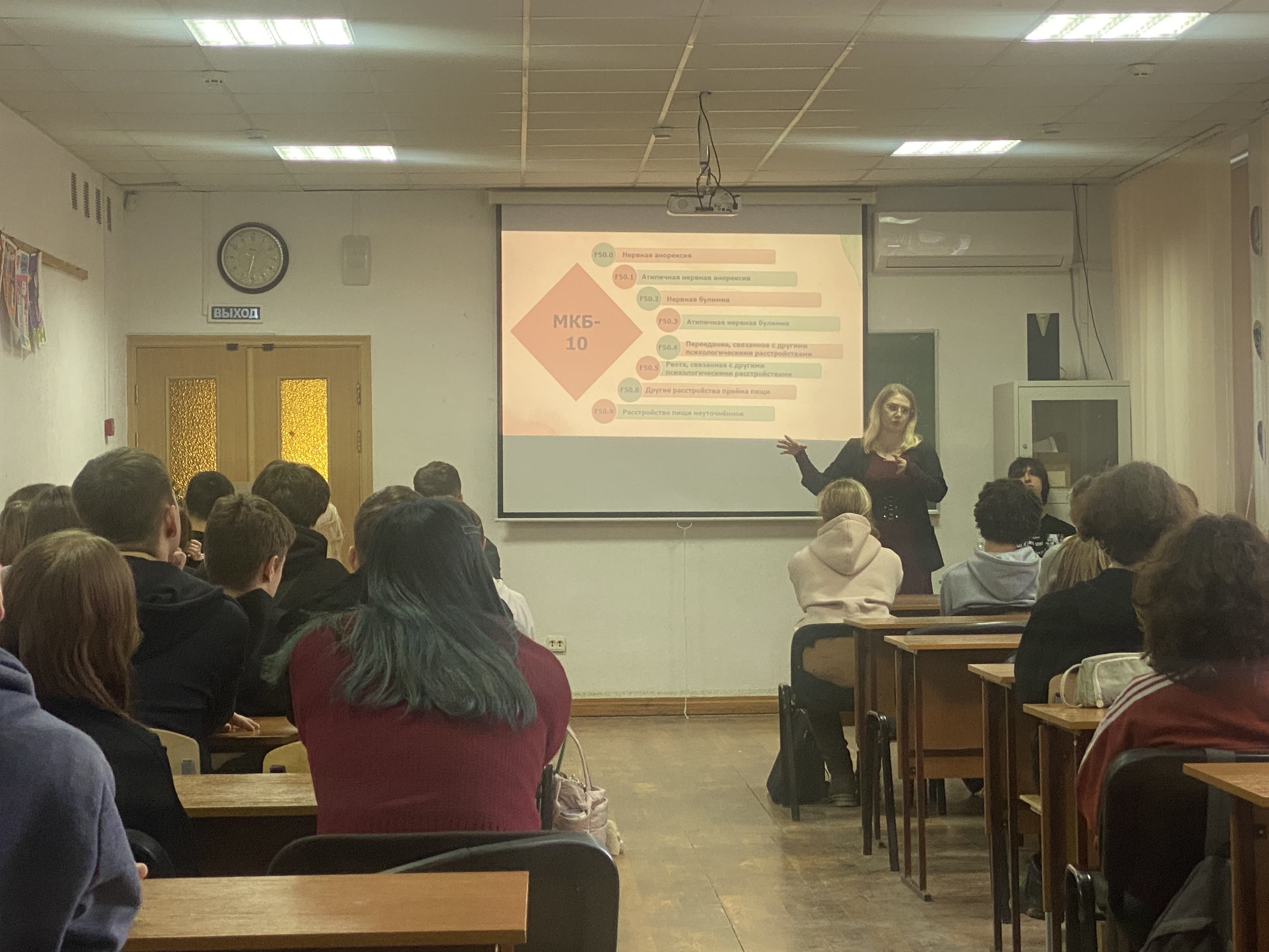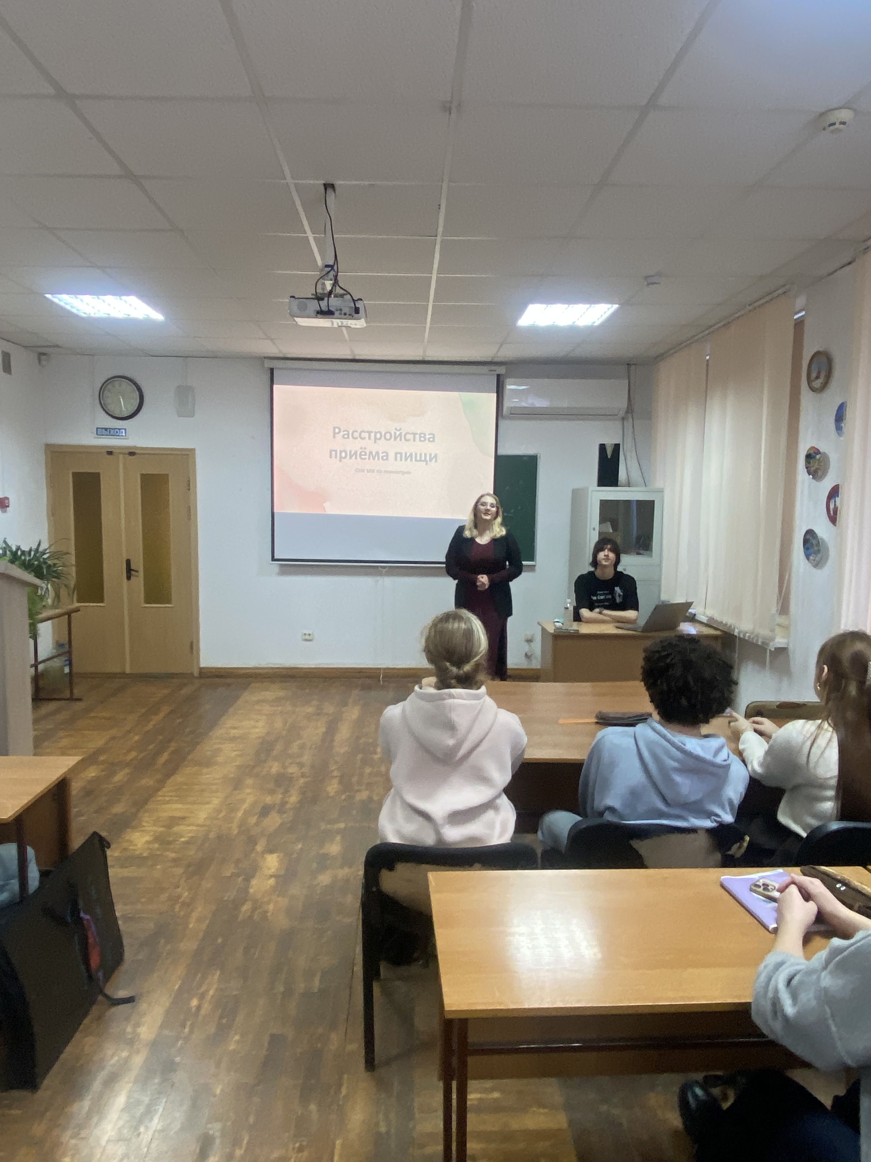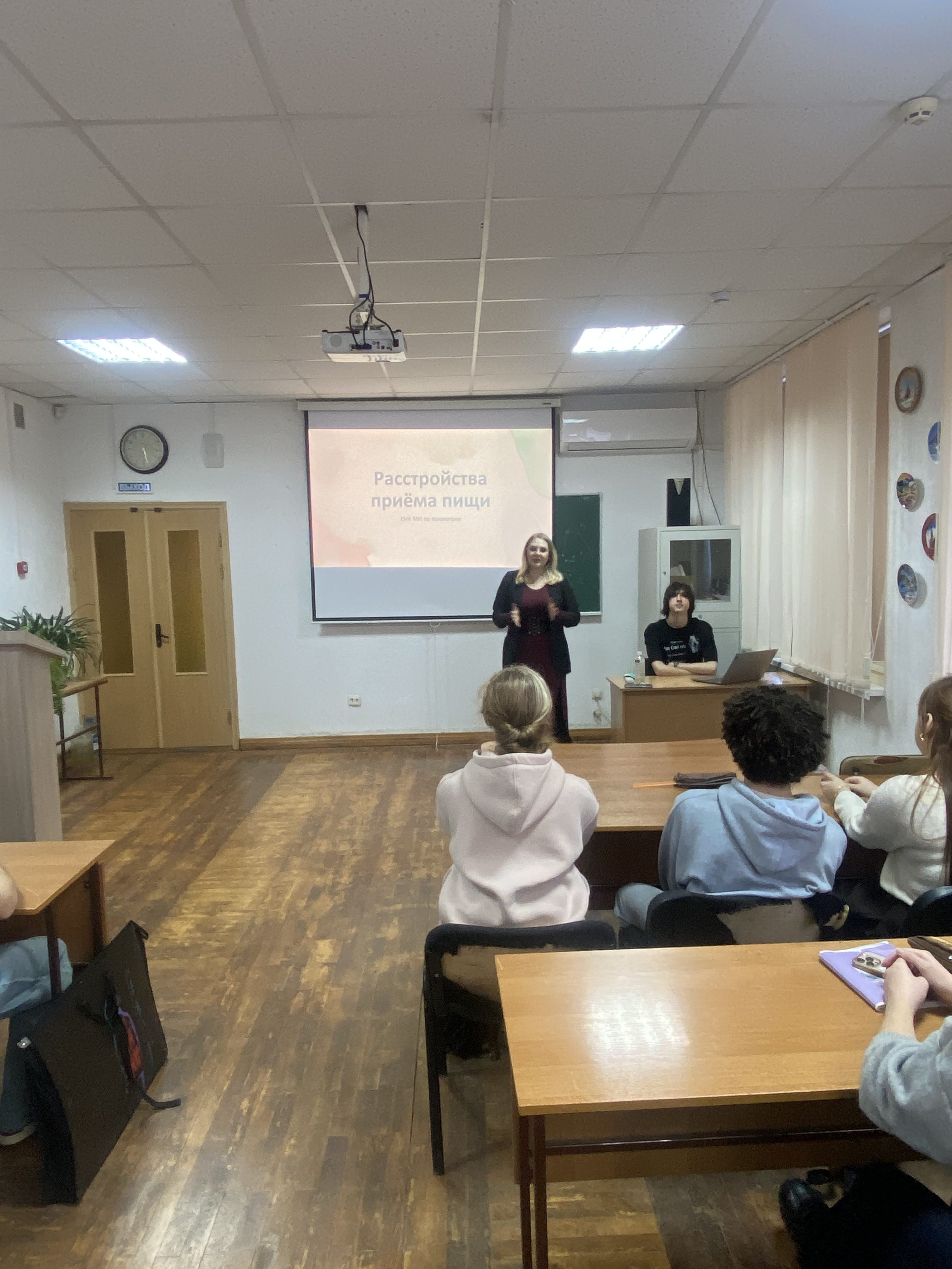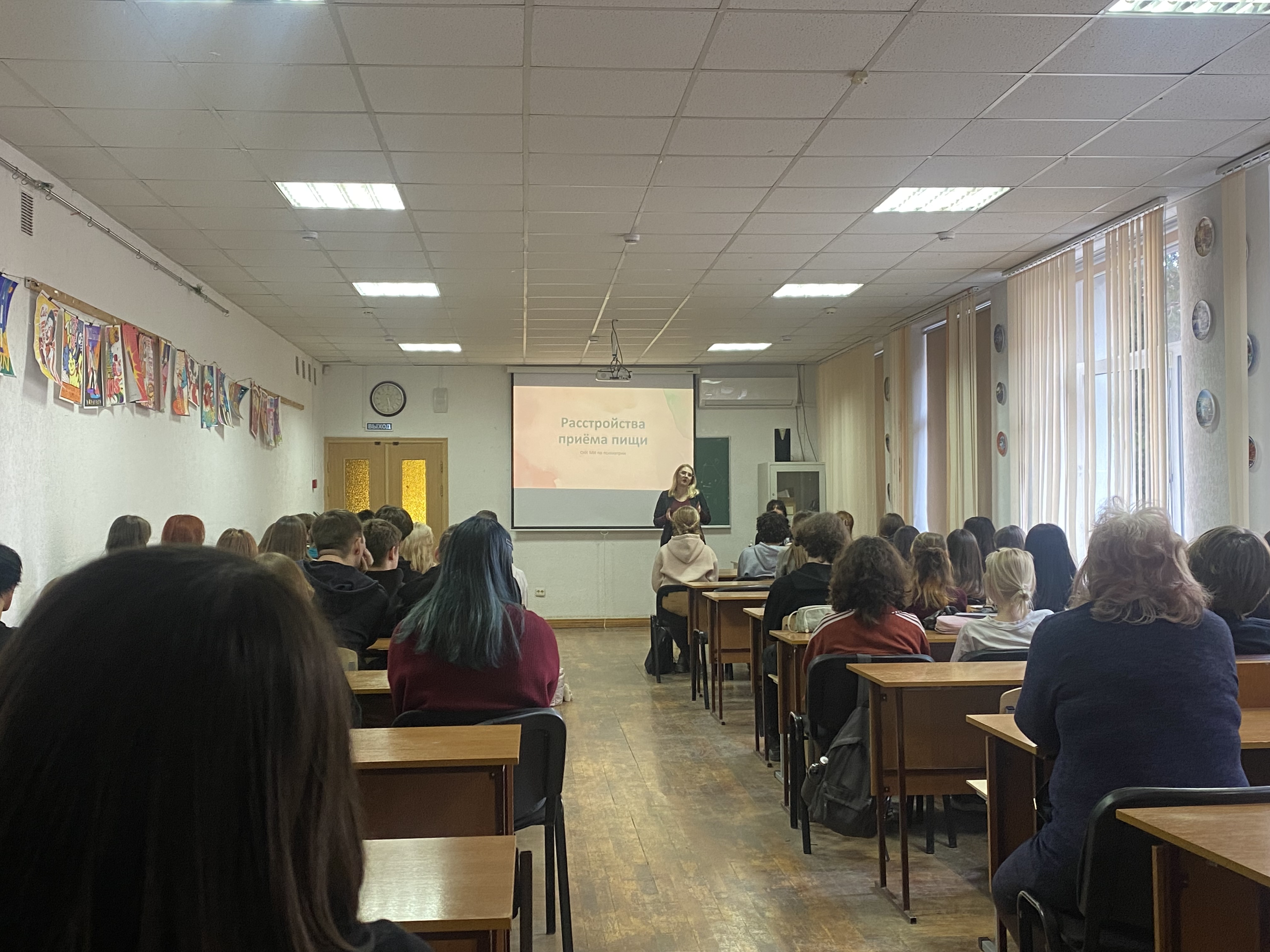 12 февраля 2026 года в Таврическом колледже была проведена профилактическая беседа с обучающимися второго и третьего курсов на тему «Расстройство пищевого поведения». Беседу проводила врач-ординатор кафедры наркологии, психиатрии, с курсом общей психологии Ордена Трудового Красного Знамени Медицинского института Щербакова Александра Дмитриевна.