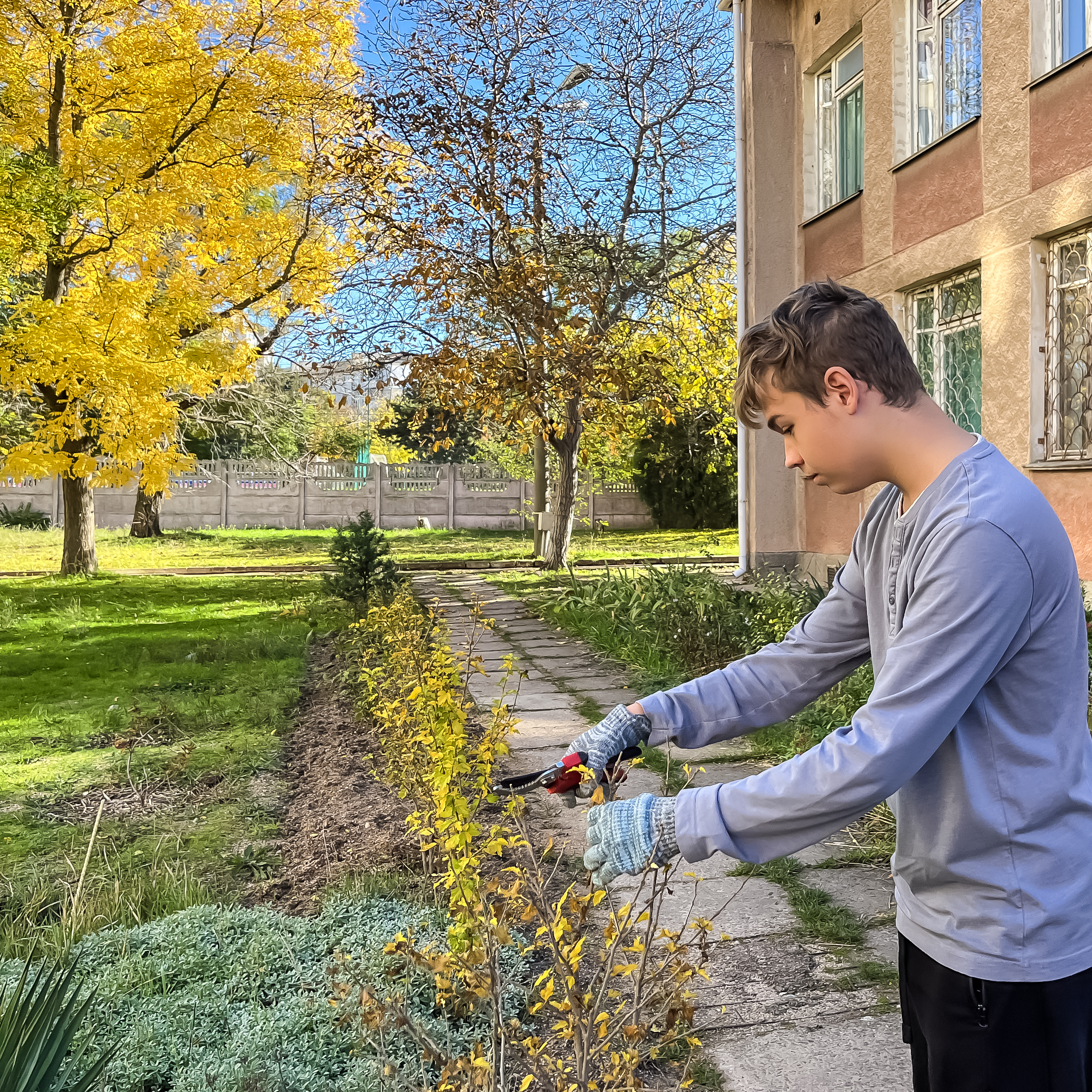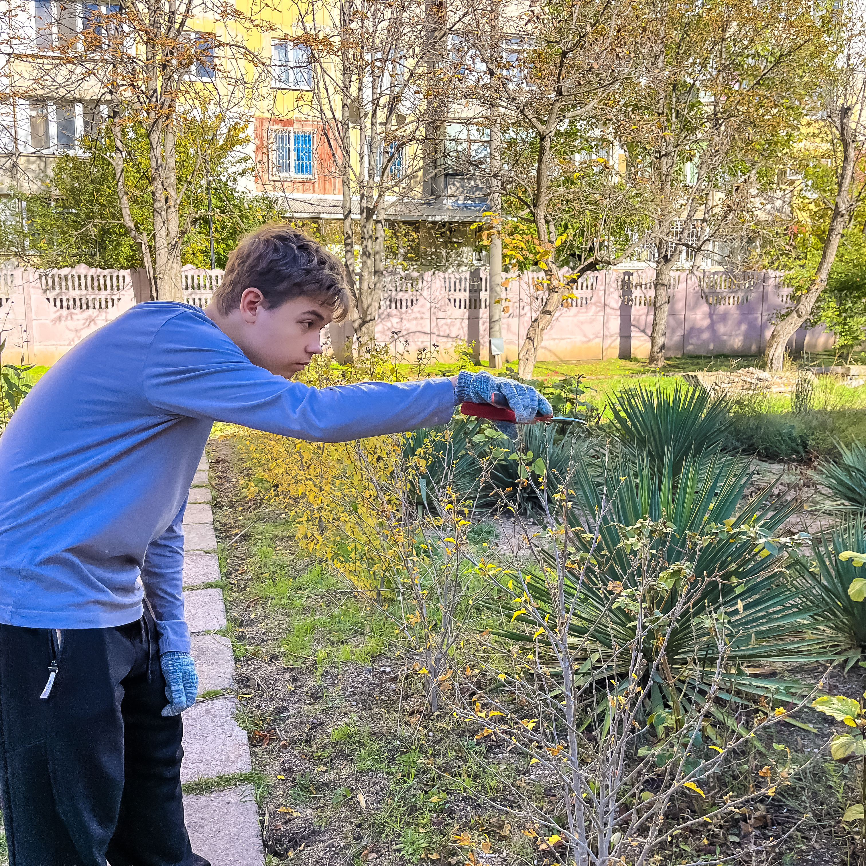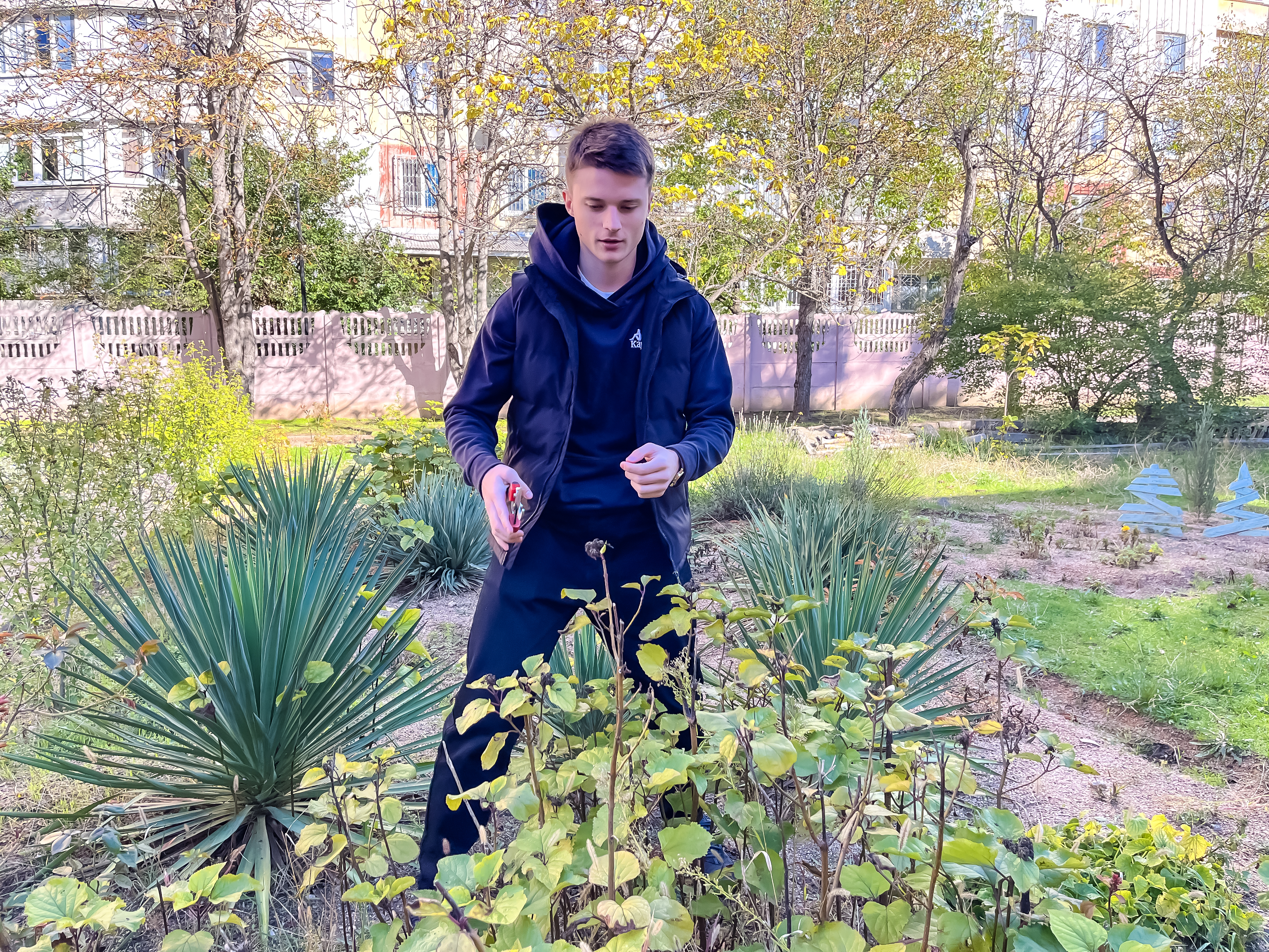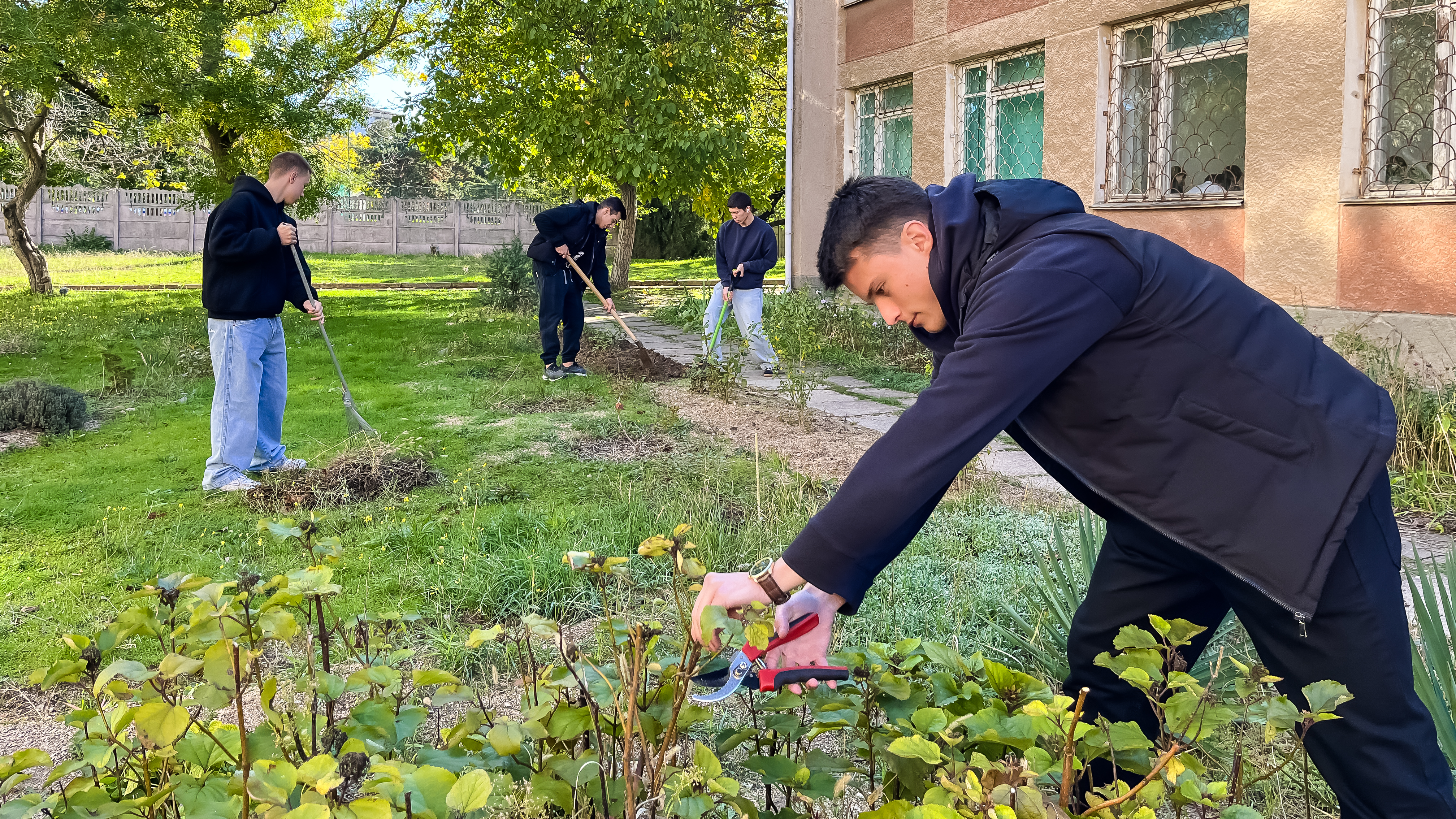 Студенты группы 3КСК29, под руководством куратора, преподавателя высшей категории Соловьева Валерия Ивановича, в свободное от учебных занятий время,подготавливают к зиме, закреплённый за группой, на территории колледжа, земельный участок. Обрезают сухие ветки, собирают опавшую листву, перекапывают землю.