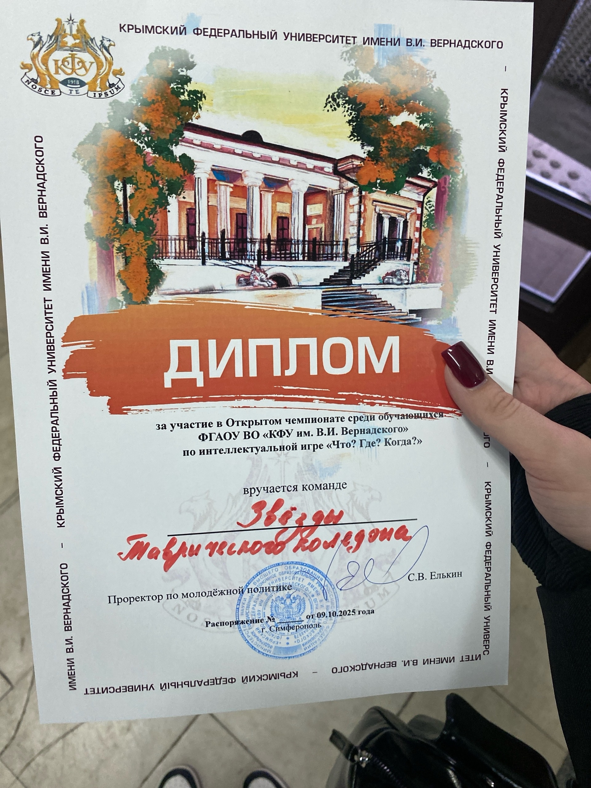 9 октября 2025 года обучающиеся Таврического колледжа приняли участие в Открытом чемпионате ФГАОУ ВО «КФУ им. В. И. Вернадского» по интеллектуальной игре «Что? Где? Когда?». Наш колледж представляла команда «Звезды Таврического колледжа».