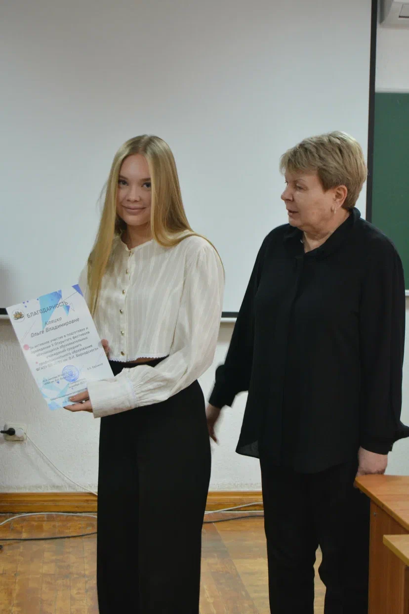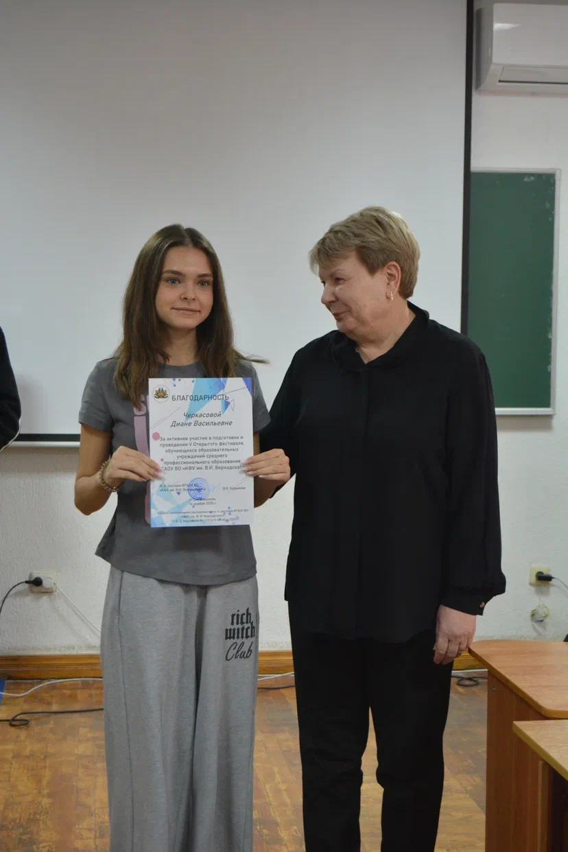 Кроме этого, Юлия Михайловна подвела итоги недели и вручила благодарности, за подписью ректора университета Курьянова В. О., студентам колледжа, которые активно участвовали в подготовке и проведении 5, юбилейного фестиваля колледжей Крымского федерального университета.