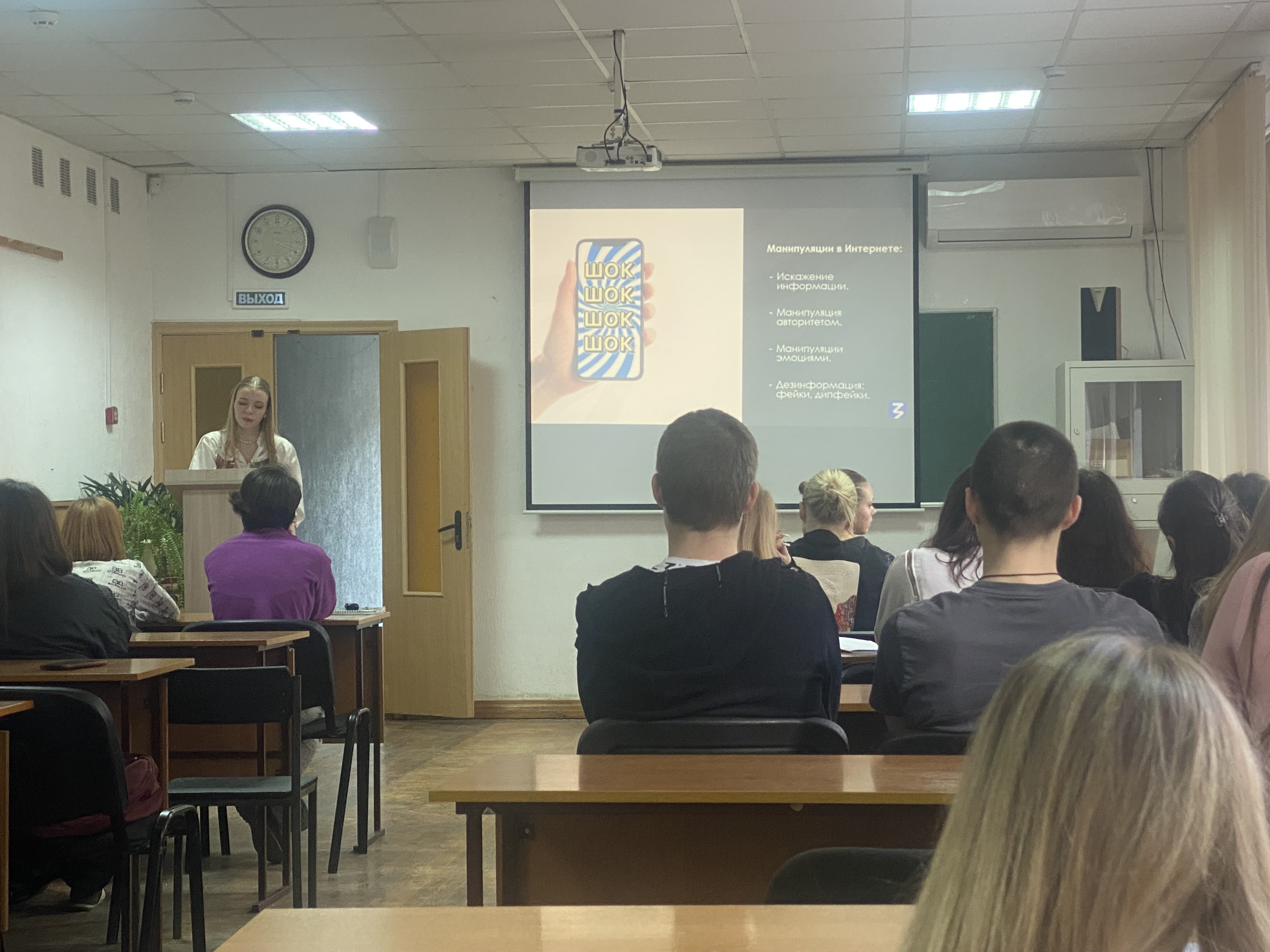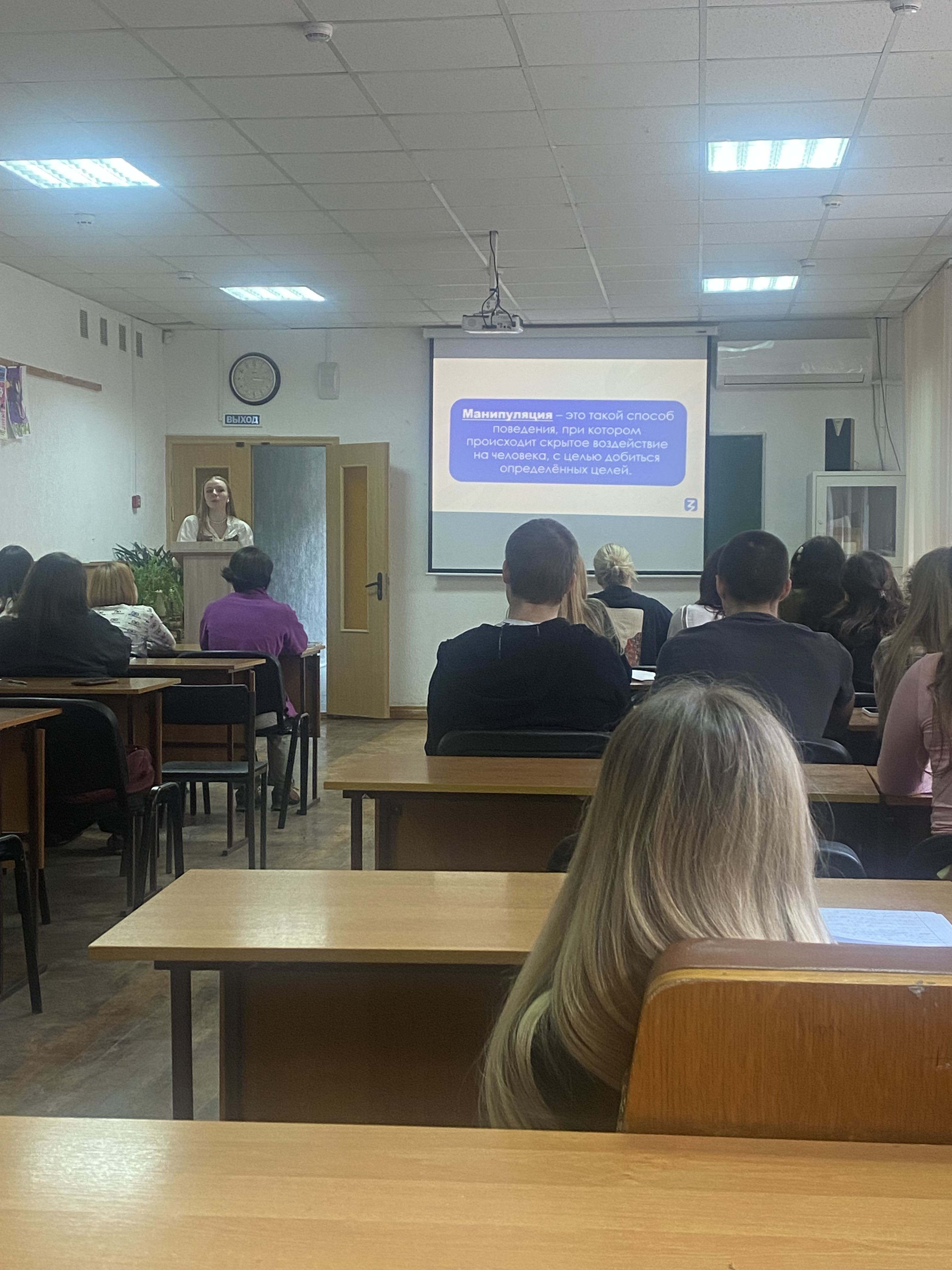 Для обучающихся специальности «Туризм и гостеприимство» прошла лекция, которую точно нельзя было назвать скучной. Специалист Центра молодежных проектов и ресурсного обеспечения Авдеева Мария, выпускница Таврического колледжа, приехала к ребятам, чтобы поговорить о насущном: «Как противостоять манипуляциям».