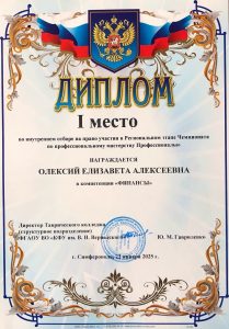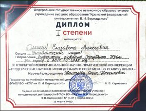 - Диплом I степени, секция: Экономические науки — ХI открытая межрегиональная научно-практическая конференция «Студенческие научные исследования в современных реалиях Крыма»;