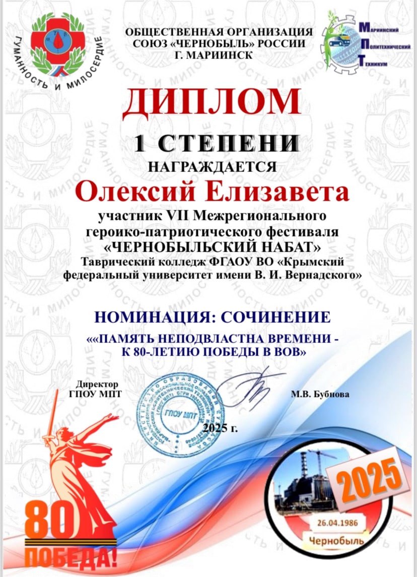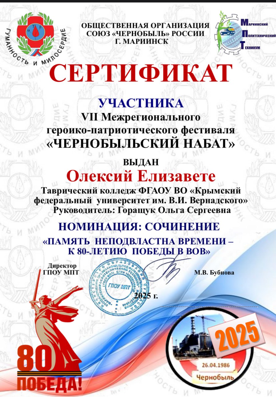 С начала обучения в колледже состою в студенческом самоуправлении, где активно принимаю участие в создании и проведении мероприятий, проходящих также в Крымском федеральном университете им. В.И. Вернадского, где были завоеваны призовые места. Постоянно принимаю участие в хроникально-документально-театрализованных постановках, посвященных Дню полного снятия блокады Ленинграда. В различных фестивалях, в том числе Открытый фестиваль учреждений среднего профессионального образования Крымского федерального университета. Свою активную позицию я начала реализовывать в гуманитарных дисциплинах: