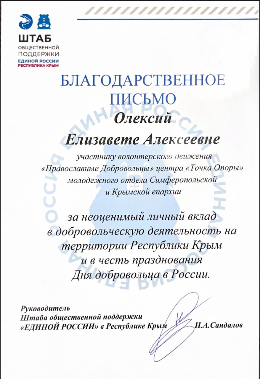 Также на протяжении года активно работаю в волонтерском движении «Православные добровольцы» центра «Точка Опоры» молодежного отдела Симферопольской и Крымской епархии под руководством председателя комитета по здравоохранению и социальной политике Молодежного парламента РК при Государственном Совете Республики Крым Волощук Е., за что была получена благодарность от руководителя Штаба общественной поддержки «Единой России» в Республике Крым.