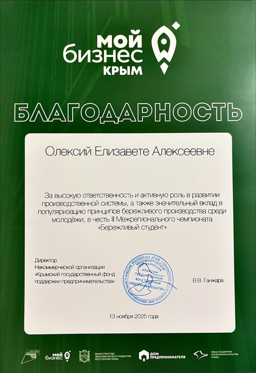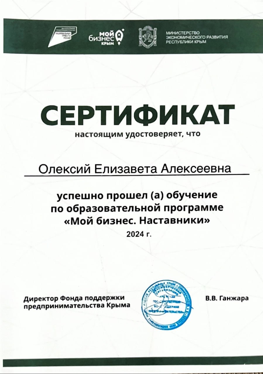 - Сертификат об успешном прохождении образовательной программы «Мой бизнес. Наставники» от Фонда поддержки предпринимательства Республики Крым;
