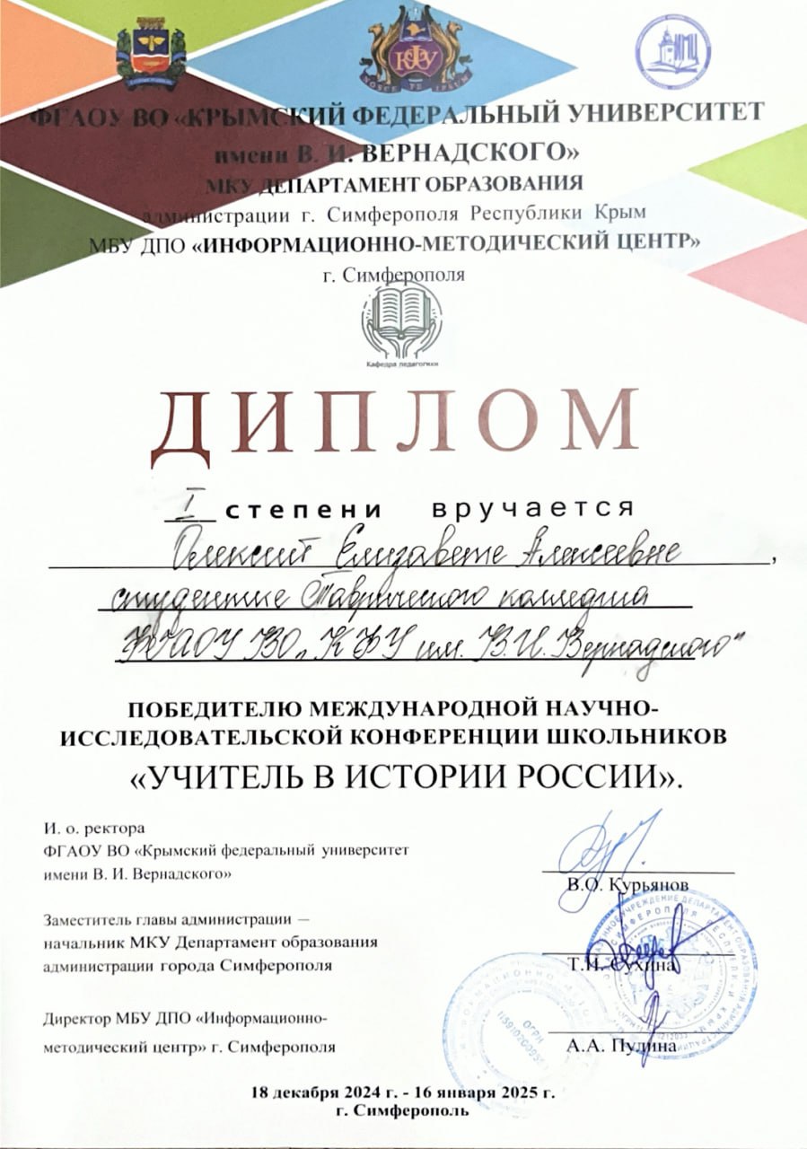- I место в Международной научно-исследовательской конференции «Учитель в истории России», проведя доскональный анализ истории развития колледжа;