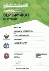- Сертификат конкурсанта Регионального чемпионата по профессиональному мастерству «Профессионалы».