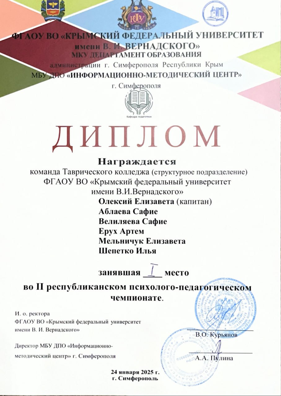 - I место во II республиканском психолого-педагогическом чемпионате;