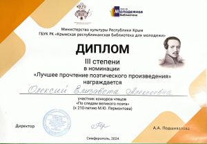 - III место в номинации: «Лучшее прочтение поэтического произведения».