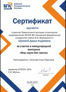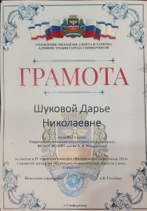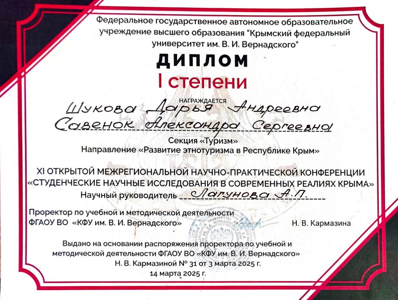 - XI открытая межрегиональная научно-практическая конференция «Студенческие научные исследования в современных реалиях Крыма», Диплом 1 степени;