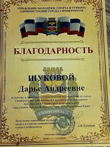 - Благодарность за помощь в проведении «Туристической велопрогулки по городу Симферополю», приуроченной к празднованию Всемирного Дня туризма на территории муниципального образования городской округ Симферополь РК;