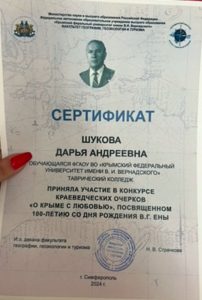 - Конкурс краеведческих очерков «О Крыме с любовью», посвящённом 100-летию со дня рождения В. Г. Ены, Сертификат;