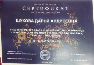 - Участник очного этапа III международного конкурса «Туристический код моей страны, города, поселка, района – PRO-туризм», Сертификат;